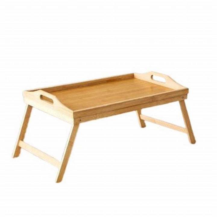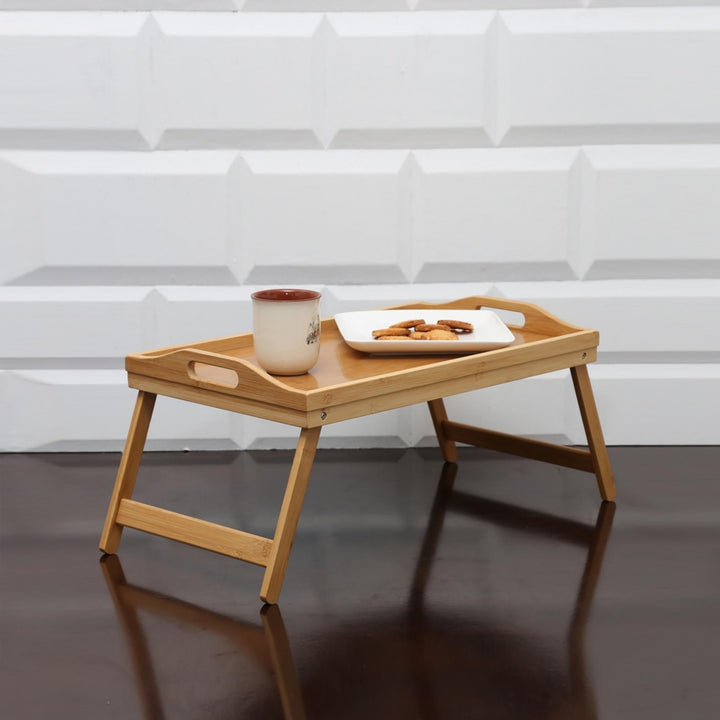 A foldable bamboo breakfast tray with raised edges to prevent spills.