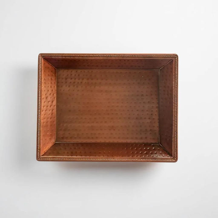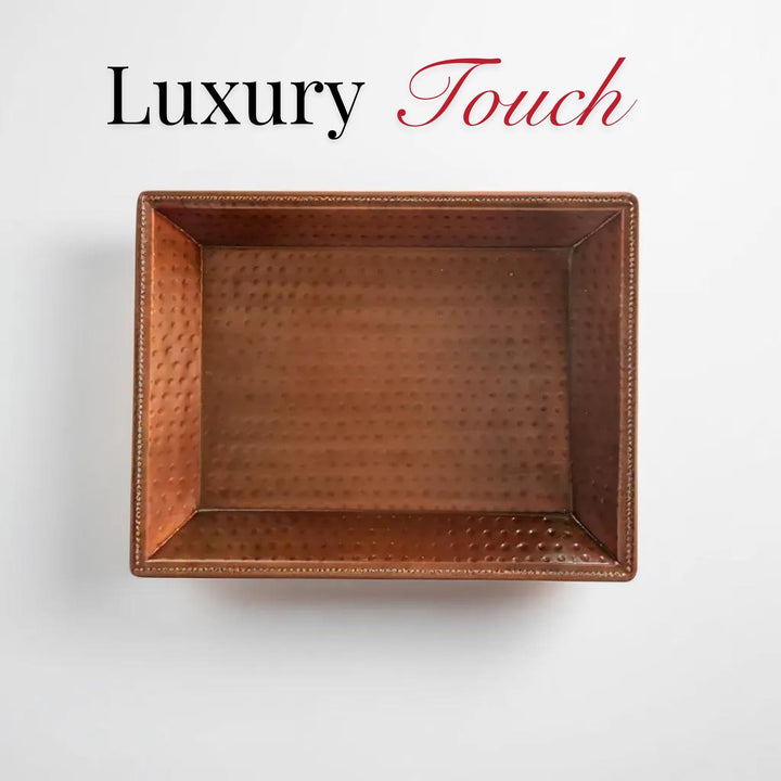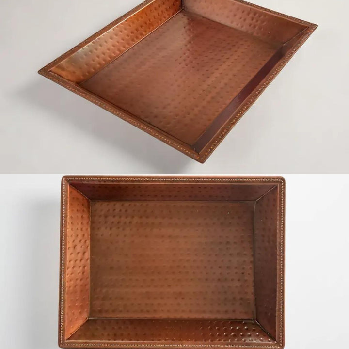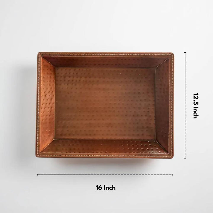 Add a touch of elegance and sophistication to your home with the LEATHERVINES Handmade Copper Decorative Serving Tray. This exquisite rectangular tray, measuring 16 inches in length, 12.7 inches in width, and 1.5 inches in height, is perfect for serving, decorating, or gifting. Its handcrafted design and high-quality copper construction make it a standout piece in any setting. Features: Premium Quality: Expertly crafted from high-quality copper, this tray is durable, stylish, and built to last. The copper finish adds a luxurious touch, making it an ideal centerpiece for any occasion. Handmade Elegance: Each tray is meticulously handmade by skilled artisans, ensuring unique character and attention to detail. The handcrafted nature of the tray means no two pieces are exactly alike, adding to its charm. Versatile Use: Ideal for serving drinks and snacks, displaying decorative items, or as a beautiful focal point on your coffee table, dining table, or sideboard. Its versatile design makes it suitable for various occasions, from casual gatherings to formal events. Easy Care: To maintain its beautiful finish, simply hand wash with mild soap and warm water. Avoid using abrasive cleaners or scrubbers to preserve the tray’s shine and texture. Thoughtful Gift: This decorative tray makes a perfect gift for housewarmings, weddings, anniversaries, or any special occasion. Its timeless design and functionality will be appreciated by friends and family. Dimensions: Length: 16 inches (40.6 cm) Width: 12.7 inches (32.3 cm) Height: 1.5 inches (3.8 cm)